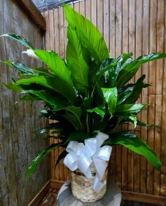 (PEACE LILY) IN A BASKET WITH RIBBON.