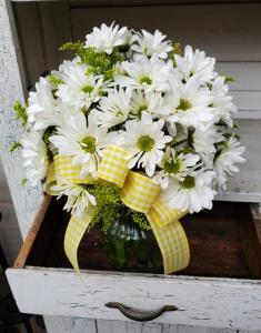 GUARANTEED TO BRIGHTEN A DAY AND BRING A SMILE. A FRESH BOUQUET OF DAISIES IN A CLEAR GLASS GINGER JAR WITH CHEERY YELLOW RIBBON.