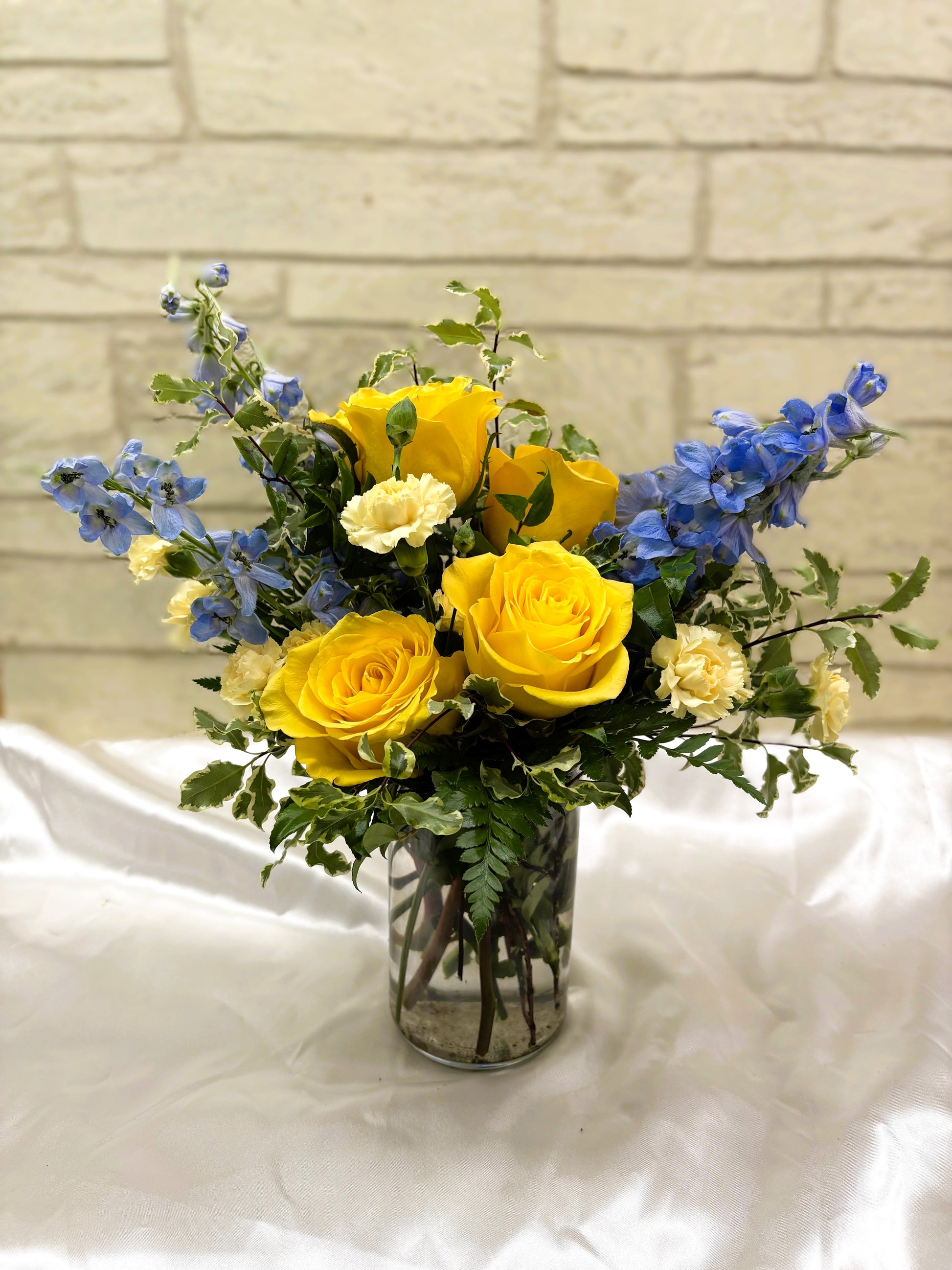 A Beautiful fresh bouquet featuring yellow roses and blue delphinium.